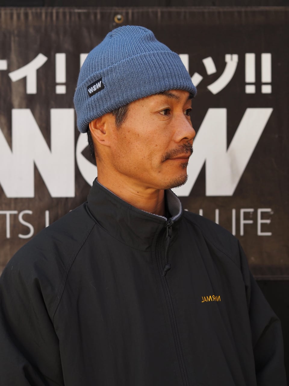超ベーシックのWOWネームタグを縫い付けたニット帽です