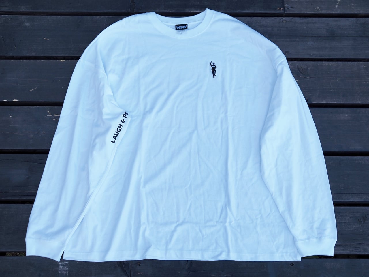 そのドギーポーズをワッペンにしてロンTシャツに付けました!そしてドギーポーズをすると右袖の裏に「LAUGH & PEACE」のプリントが!(Tシャツヴァージョンより少し大きめのプリントです)